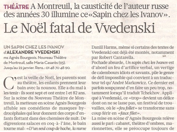 “La mise en scène d’Agnès Bourgeois se préoccupe toujours de rythme et de fluidité, avec des acteurs qui multiplient les rôles à plaisir. Mais elle fait mieux encore, en faisant entendre, derrière la farce, une forme de mélancolie radicale […]”