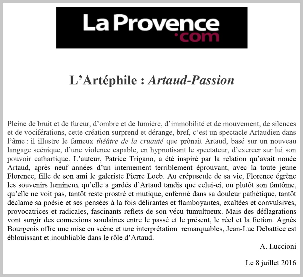 “entre le passé et le présent, le réel et la fiction… Agnès Bourgeois offre une mise en scène et une interprétation remarquables, Jean Luc Debattice est éblouissant et inoubliable dans le rôle d’Artaud. […]”