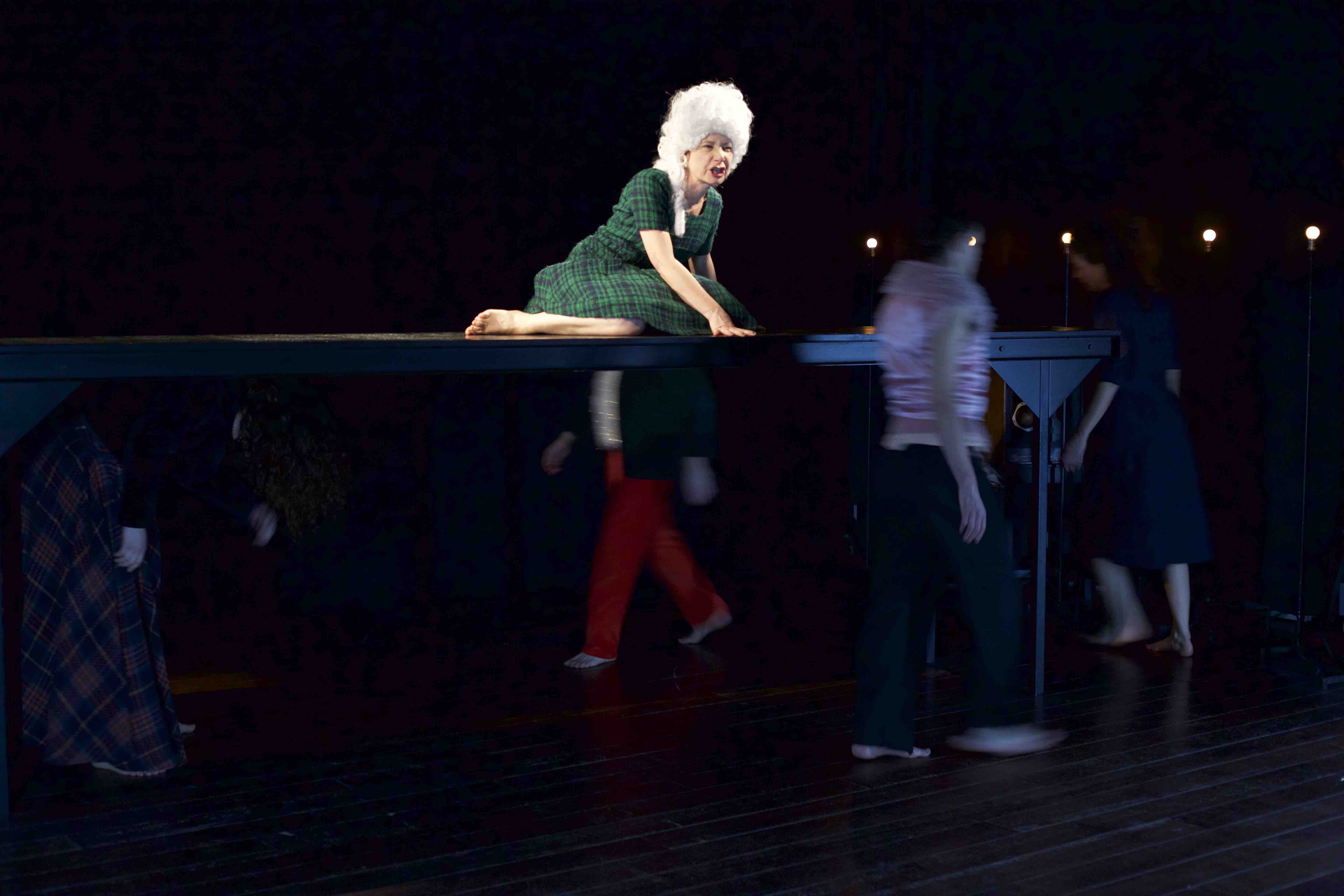 Dans cette mise en scène, les corps sont sous contrôle et pour donner à voir la violence du désir c’est l’ouïe du spectateur qui est d’abord sollicitée.