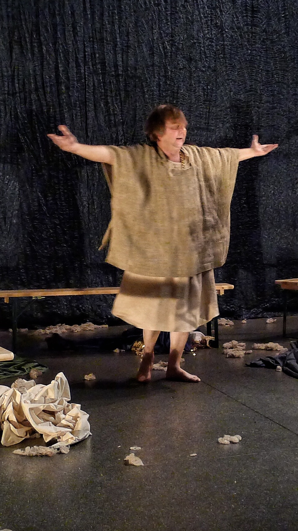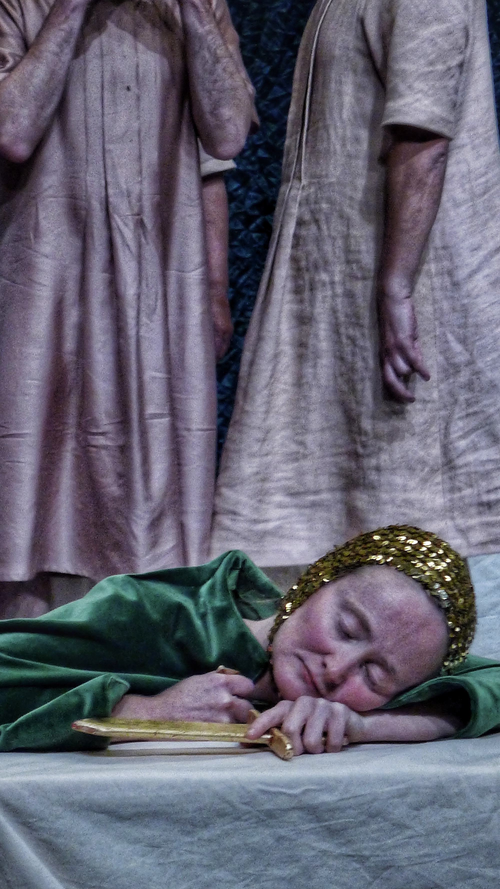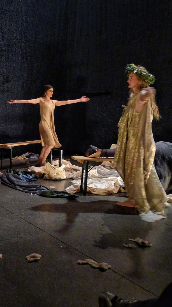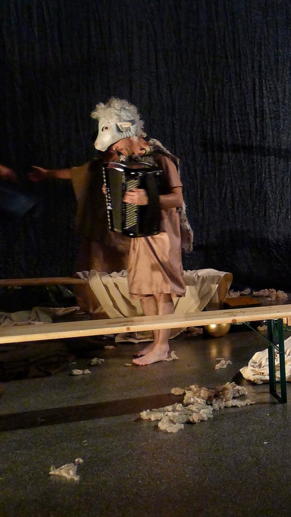 Un geste et un regard porté sur ce geste, et le soupçon d’adultère vient brutalement briser une amitié très ancienne entre deux rois. Tout bascule dans la haine la plus violente, avec pour conséquence immédiate la mort d’un héritier, de sa mère la Reine, et l’abandon de l’enfant qui vient de naître. Nous allons assister alors à la longue et difficile reconstruction de ceux qui restent, déboussolés. Au cœur de la fable, de la narration, notre reconstitution s’articule autour de deux images clefs. D’une part le regard posé par Léontès sur un geste d’Hermione vers Polixènes, qui conduira au sacrifice du fils et au désastre, et d’autre part le moment où l’ours dévore l’homme qui est censé sacrifier le bébé, moment qui sera suivi d’une renaissance.