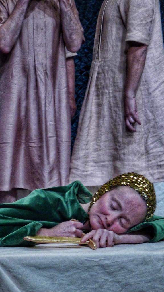 Mais chaque corps contient son propre monstre qui surgit lorsqu’on ne s’y attend pas et le déborde. Shakespeare a choisi de faire apparaître d’emblée le monstre de Léontès, car sa position de roi rend les conséquences plus flagrantes. Nous sommes dans un conte et les figures sont emblématiques, lointaines.