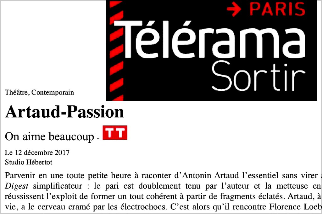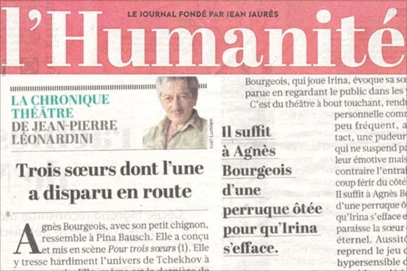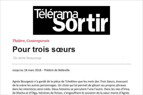 Presse Marguerite, une idée de Faust – L’Humanité → Pour trois soeurs – Télérama Sortir → à TABLE ! Opus 3 : Violence du Désir – Le Dauphiné Libéré → Alice, de l’autre côté du miroir – Paris Mômes → Alice, de l’autre côté du miroir – Télérama → Un sapin chez les Ivanov – Libération → Artaud-Passion – Télérama → Pour trois soeurs – L’Humanité → TOUTE LA PRESSE